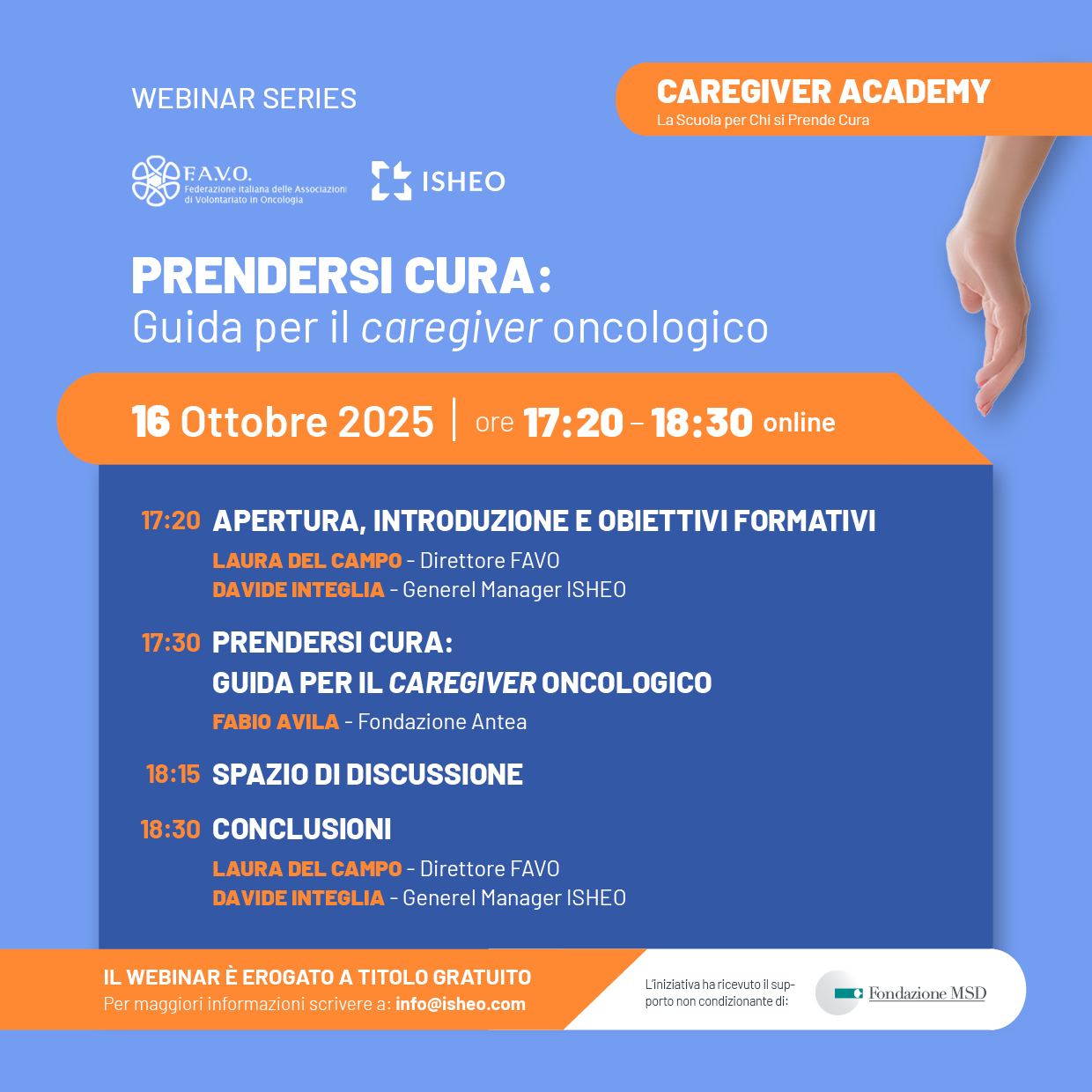 Il 16 ottobre 2025, dalle 17.20 alle 18.30, si terrà il nono appuntamento della Caregiver Academy, realizzato in collaborazione con ISHEO e con il contributo non condizionato di Fondazione MSD, in osservanza del codice etico di FAVO.